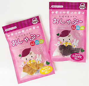 ★「おしゃぶー あんのう芋」「同 むらさき芋」。袋はチャック付きで衛生的。1袋30g 300円(いずれも税別)
