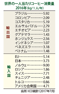 国際コーヒー機関(ICO)の統計(2017年7月)によると、国民1人当たりのコーヒー年間消費量(kg/1人/年)が最も多い国は、ノルウェー(9.00kg)、次いでスイス(7.71kg)、ブラジル(5.92kg)、コスタリカ(5.19kg)、EU(5.14kg)と続きます。