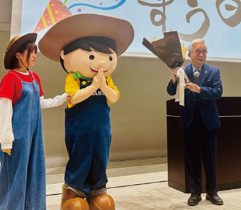 スジャータめいらくグループの日比治雄代表は「今日伺った健康長寿の秘訣を私も実践し、サーチュイン遺伝子活性化のため、当社のざくろジュース『ざくろ100%』を毎日飲み、大村先生のようにいつもニコニコとプラス発想を心掛けたい。百寿会は、みなさまの食と美と健康のお役に立つために活動しており、スジャータめいらくグループも100年企業を目指し努力を続けている。みなさまとの出会いに感謝し、元気に再会できることを願っております」とあいさつした。