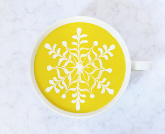 「スジャータアート」体験で、ポタージュの表面にスジャータで絵を描いた親子は「飲むのがもったいない」「家でもやってみる!」とうれしそうに話していました。