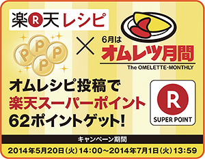 楽天スーパーポイント62ポイントゲット」キャンペーンを、5月20日午後2時~7月1日午後1時59分の期間限定で開催、オムレシピの投稿を募集します。