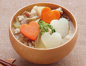 (1)豚肉は3cm幅に切る。じゃがいもは5~6mm幅のいちょう切りに。大根、にんじんは薄い輪切りにし、ハート型で抜く。ごぼうはささがきにし、5分ほど水にさらして水気をきる。