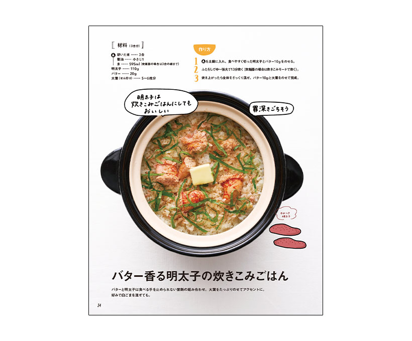 本の中身ちょっと拝見:「バター香る明太子の炊き込みごはん」は、たっぷりのせた大葉がアクセントに!