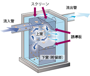 ●旋回流式夾雑物除去用スクリーン装置「ユニフィルター」(特許取得済み) (株)ハネックス TEL 03-3556-2802 * 工場排水の夾雑物除去に画期的な技術が登場した。「ユニフィルター」は、排水を取り込んだ水槽内に旋回流をつくり出すことで、スクリーンを目詰まりさせることなく、効率的に夾雑物と排水を分離させられるシステム。 夾雑物を取り除くまでのプロセスは次の通