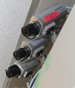 床から2.4mの高さに設置した3種類のカメラ。向かって右が高解像度(130万画素)デジタルカメラ、真ん中がVGA(30万画素)デジタルカメラ、左がアナログ(NTSC)カメラ。