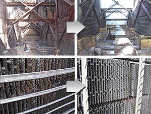 クーリングタワーの殺菌洗浄前(左)と後(右)