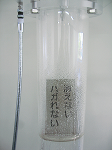 ○小間番号=3A-07 (株)ラスカム TEL 078-221-6676 * ◆「洗浄テスト」「目盛りサンプル展示」などでマーキングシステムの魅力を訴求 ラスカムはFOOMA出展5回目の今回、ドイツ・オストリング社製「電解マーキングシステム」を展示し、実演を行う。シャワーブース内にマーキングサンプルを設置して実際に水を流し、マークが「消えない