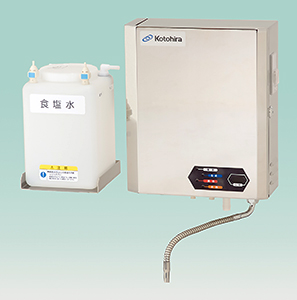 ●小型タイプの電解次亜水生成装置「KEC-S01」 (株)太幸 TEL 0798-40-0135 * 電解次亜水は、水・塩・電気のみから作られ、直接食材に使用できる弱アルカリ性の除菌洗浄水。薬剤を一切使用せず、また低濃度で除菌できるため、食材・機器へのダメージが少なく、手指の洗浄をしても手荒れの心配はほとんどない。除菌・洗浄・脱臭・漂白の4つの働きで食中毒菌をシャットアウトするため、食材に安心