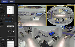 ビューアーで見る全方位カメラの映像。左上と下の2つの映像は、右上のオリジナル画像から切り出し、自動補正をかけたもの