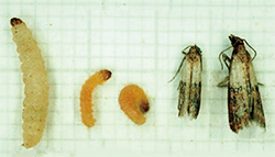 写真2 ノシメマダラメイガの幼虫(左)と成虫(右)