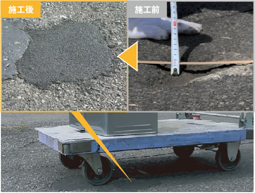 「リペアキッド アスファルト補修小僧」。台車も安全に通ることができる