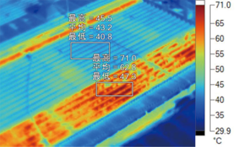 サーモグラフィーを使った遮熱効果の実証実験結果。塗装面は青色~緑色で、表面温度があまり上昇していないことが分かる