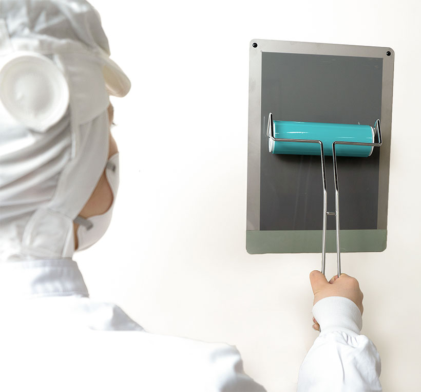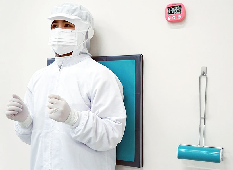◇特集・異物混入対策 ~原因分析と適切な対応[硬質・軟質異物、毛髪編] ●ユニフォームに付着した毛髪やほこりを効果的に除去 (株)エクシールが開発・製造・販売する、ウレタンゲルの特性を生かした各種異物混入対策製品。その中でもユニフォームに付着した毛髪やほこりなどの異物を効果的に取り除くツールとして注目されるのが、「ボディローラー」「Dクイック」「ハイメンマット」の3製品だ。