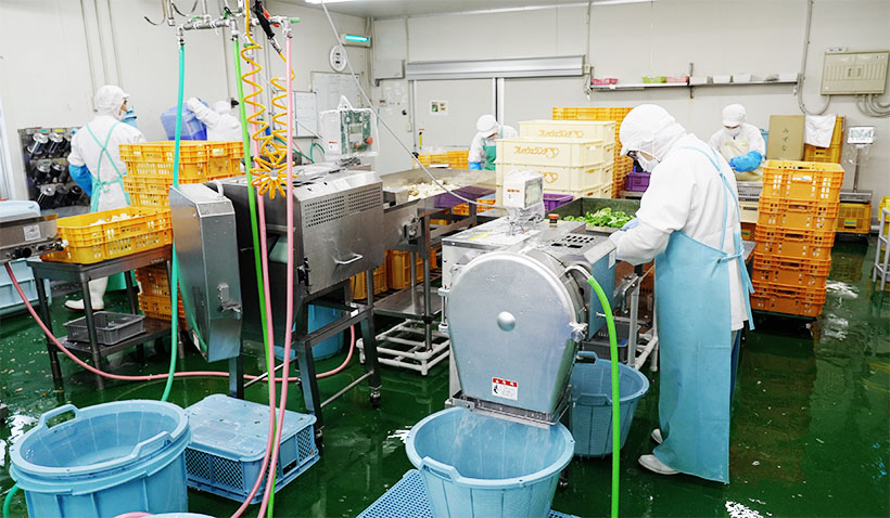 野菜の適性に合わせた方法で下処理し、機械や手作業でカット。洗浄・殺菌を経て計量・包装