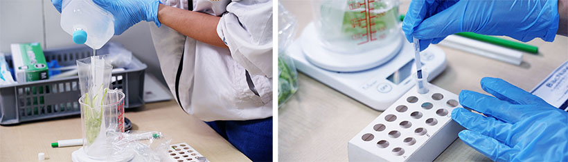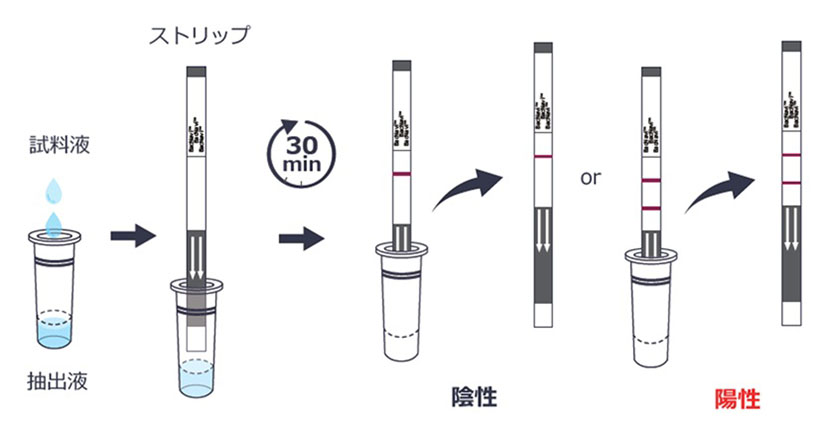 BacNavi の操作手順。前処理(左)した試料液にストリップを刺すだけ(右)。30分後にストリップ上に現れる紫線の本数と色の濃さで判定