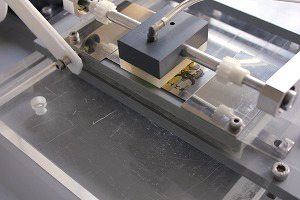 (写真1)スポンジにアルカリ性洗剤を付けて1万回こする試験(洗浄実験装置)