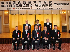 第21回食品安全安心・環境貢献賞の受賞者。(前列左から)味の素ゼネラルフーズ、国分、日清製粉グループ本社、丸美屋食品工業、みたけ食品工業、(後列中央)テーブルマークの皆さん