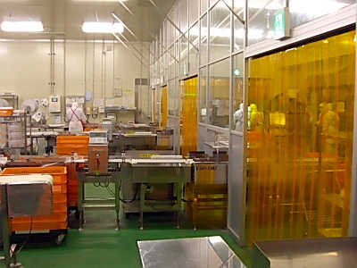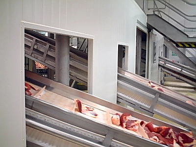 ◆大型工場における食材の移動 ゾーニング間の食材の移動は、工場の規模が大きい場合、壁に通過口を開ける方法がある。清潔レベルの高い方の気圧を高くすれば、さらに安全になる。 オーストラリアのある食肉処理施設では、枝肉をばらして部位別の肉にする「準清潔ゾーン」の作業室から、真空パック工程とハンバーガーパティに加工する工程である「清潔ゾーン」の部屋に肉を移動させるのに、壁に穴を開けてコンベヤを通し、移動させていた。清潔ゾーンの方が