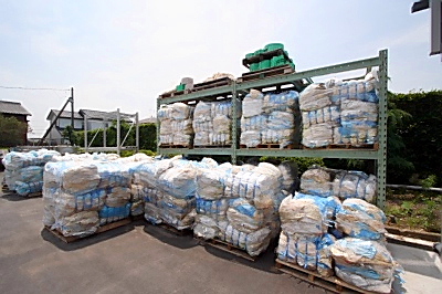 リサイクルセンターの一角にある保管場所。袋は梱包機で圧縮後、回収事業者に出荷される。洗浄により保管時の衛生面も大幅に改善した