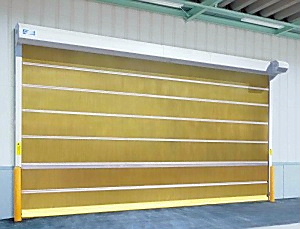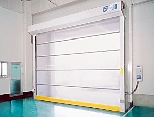 ○三和シヤッター工業(株)〈TEL03・3346・3011〉 ◆高速シートシャッター「クイックセーバー・KRシリーズ」 * 「クイックセーバー」の高耐風圧タイプ。骨材を太くして全閉時の耐風圧を390Pa(=風速25m/秒)にアップさせるとともに、運転可能な動作可能風圧を250Pa(=風速20m/秒)に高めたことで、強風時での開閉が可能になった。 併せて、人や車両