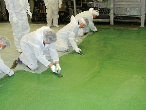 ●防カビ仕様のHACCP対応高性能耐久床材「ピュアクリート」 (株)キューケン TEL 03・5781・8039 * 「ピュアクリート」は、防カビ仕様のHACCP対応高性能耐久床材。これは、(株)キューケンが主力商品である水系硬質ウレタン樹脂塗床材「ピューマフロアー」の今後の国内市場での成長およびアジア地域を中心とするグローバルな戦略を検討し、「防カビ性能」を付与して品質をさらに食品工場のニ