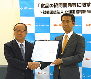 セコマの丸谷智保社長(左)と北海道循環器病院の津久井宏行理事長