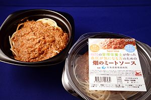 【北海道】セコマは12日、北海道循環器病院との共同開発アイテム第3弾として「Secoma病院の管理栄養士が作った血圧が気になる方のための畑のミートソース」(チルド)=写真を道内全店で発売した。 同品は、脂質を控えめにして1食当たり281kcalに抑え、塩分も1食当たり1.2gにした。「脂質」「塩分」は、標準(日本食品標準成分表・2015年)のミートソース、スパゲティと比べ脂質が約28%、塩分で約62%カット。ひき肉を使わずに大豆やキノコ、野菜でうま