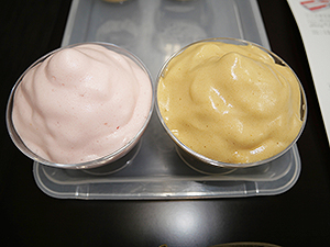 「ふわあわクイック」で作った試作品「ストロベリー」(左)と「ワサビ醤油」