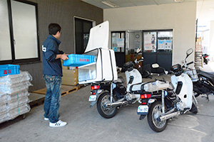 新聞配達バイク(右)の横で、食品専用バイクに森永商品を積み込む