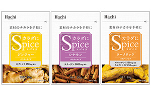 【関西】ハチ食品は、新シリーズ「カラダにSPICE」の商品として、「シナモン」「ジンジャー」「ターメリック」の3品=写真=を、22日に発売する。 「素材のチカラを手軽に」をコンセプトに、注目を集めるスパイスを手軽に常用できる商品だ。 スパイスに加え、シナモンにはコラーゲンを8000mg(1袋30g当たりの配合量)、ジンジャーにはビタミンEを150mg(同)、ターメリックにはオルニチンを1500mg(同)配合している。