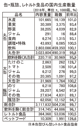 ●コーン缶は災害響き大幅減 16年(1~12月)の缶詰・瓶詰・レトルト食品の国内生産量を27日、日本缶詰びん詰レトルト食品協会が発表した。 それによると、缶詰はスーパー売場を主体とする丸缶(飲料除く、以下同)が前年比4.1%減の22万0718tだった。その約半数を占める水産缶は、1%増の10万1665tで2年ぶりに増加した。うちサバ缶が15.8%増の3万7117tと全体を押し上げた。漁獲量の増加も後押しし、各社が商品化に注