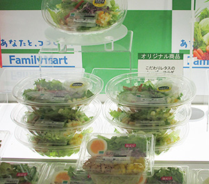 ファミリーマートは野菜サラダの原料、工場の設備、容器や盛り付け方法、ドレッシングを見直し14日から全店で販売している。 野菜サラダは健康志向を受けて、10年間で日販が1.5倍に増えた。販売ピークの7、8月に向けて、野菜のおいしさを追求した新商品10品目を発売した。今年度の野菜サラダ売上げ目標は前年比50%増、サラダ全体でも30%増を目指している。 野菜サラダで使用量の多いレタスは、長野県の標高800m(東北地区は岩手県の標