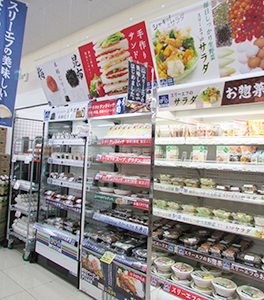 スリーエフは、ドラッグストア(DgS)チェーンのクリエイトSDの神奈川・東京12店に米飯、惣菜、デザート、パンなどオリジナル商品約150品目の供給を順次進めている。スリーエフの売場をそのまま再現することで来店客への訴求力を高め、認知度アップにつなげる。クリエイトSDは女性客比率が高いことから、スリーエフ既存店への送客、新商品開発への効果も期待できる。 クリエイトSDからの申し込みで実現した異業態連携。スリーエフのメリットについて、榎本章マーケティン