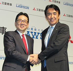 両社の関係を「同志」と表現した竹増貞信ローソン社長(右)と京谷裕三菱商事常務執行役員