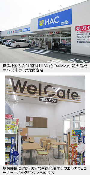 ウエルシアホールディングス(HD)は、16年9月に吸収合併したCFSコーポレーションのドラッグストア(DgS)「ハック(HAC」の“ウエルシアモデル”転換を進めている。食品・酒類の強化で子育て世代の女性中心に客数が増え、それがH&BC(医薬品&化粧品)にも波及効果を発揮している。  旧CFS店舗は、知名度の高い横浜地区約200店は「ハック」ブランドを継続使用しているが、他地区は内外装ともウエルシアモデルに転換した。旧CFS既存店売上げ伸び率は16年9