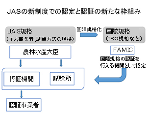 農林水産省は9日、自民党の食料戦略調査会・農林部会の合同会合にJAS法などの改正案の骨子を示した。JASの対象品目拡大の考え方を昨年8月に明らかにしていたが、JAS規格をコーデックス委員会の規格、国際標準化機構(ISO)の規格に発展できる仕組みを提示した。農水省の関連団体である農林水産消費安全技術センター(FAMIC)をISOなど国際的な民間規格の認定機関にし、認証機関を認定できるようにする。格付け率が減少傾向にあるJAS制度そのものの強化と、制度の活用による日本産品の国際