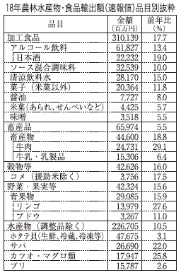 農林水産省が8日に公表した2018年の農林水産物・食品の輸出額は9068億円、前年同期比で12.4%増、今年の目標である1兆円が見えてきた。関税番号で分類されている加工食品だけでも3100億円を超え、17.7%増で確実に伸びていて輸出を支えている。 農林水産物・食品の輸出額は関税番号で分類されていて、乳製品が畜産品に分類されている。輸出に占める食品産業の位置付けは極めて高い。 加工食品のうち清涼飲料、アルコール飲料、ソース