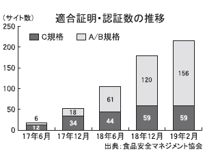 食品安全マネジメント協会(JFSM)は1日、自民党の食料産業政策委員会で日本発の食品安全マネジメント規格(JFS)の普及について目標を示した。HACCPの義務付けを受けて、厚生労働省が認めた手引きを基にしたJFS-A規格と、「HACCP7原則」を使ったJFS-B規格を現在の156事業所から、2021年12月までに2309までに拡大、FSSC22000と同等性のあるJFS-C規格を59から496事業所にする考えだ。そのために認証機関・監査会社数も現在の30から46機関にする。