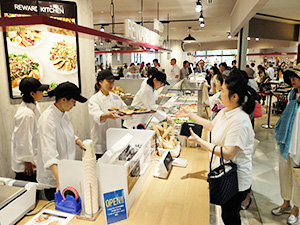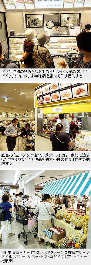 イオンリテールが7月28日に開店した子会社イオンリテールストアの「イオンスタイル新浦安MONA(モナ)」(千葉県浦安市)は、近隣在住の30~50代の働く女性に照準を合わせ、健康志向を打ち出すことで惣菜の即食需要への対応を狙った“即食系”小型食品スーパー(SM)だ。5月にイオンスタイル業態に改装したイオンリテールストアの総合スーパー(GMS)「イオン新浦安」のサテライト店舗という位置付けで、GMSイオン新浦安の食品売場がファミリー層に照準を合わせて惣菜の即食需要に対応すること