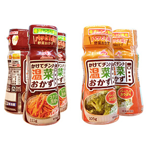 「かけてチン♪温菜おかず〈バーニャカウダ味〉」(右)と「同〈コクうま黒酢味〉」