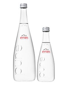 「エビアン グラスボトル750ml」(左)と3月中旬発売予定の「同330ml」