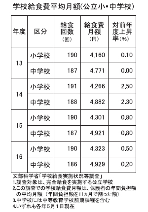 文部科学省「学校給食実施状況等調査」によると、2016年5月1日現在の公立小・中学校の学校給食費平均月額は、小学校前年比0.5%増の4323円、中学校同0.2%増の4929円となっている。14年4月1日から消費税が5%から8%へと増税され、全国平均で14年から翌年にかけ増税分は給食費にプラスされている。 しかし、それ以上に問題となっているのが、食材費の高騰だ。学校給食の献立は、予算の中で提供されるため、子どもたちに人気のデザートの提供頻度が激減して