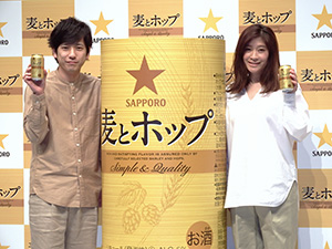 イベントではCMに出演する二宮和也と篠原涼子が登場。6月末まで実施する「“それだけでうまいコンビ”当たる!」キャンペーンの商品である食材セット(牛肉とわさび、蒸したウニの海苔巻き)を試食後、リニューアルした「麦とホップ」で乾杯した。