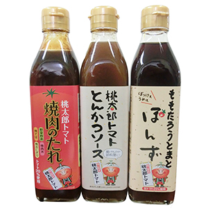 「ももたろうとまとぽんず」(右)に続いて「桃太郎トマトとんかつソース』『桃太郎トマト焼肉のたれ』を開発