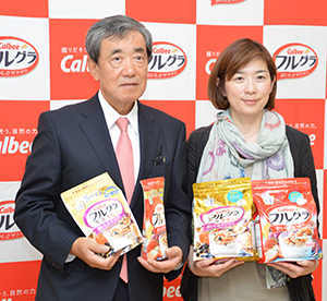 カルビーは人気のグラノーラ「フルグラ」でシニア市場を開拓する。減塩ニーズを持つシニア層をターゲットに据え、新需要を獲得する考え。パッケージに食塩量を表示することで、和・洋朝食よりも減塩できることを訴求する。さらに小容量サイズを投入し、トライアルを喚起する。18年度までに売上げ500億円を目指す。 3日の会見で、松本晃会長兼CEOは「日本人は特に血圧が高い。さらに、毎日決まったものを食べる年長者に着目した」と狙いを語った。