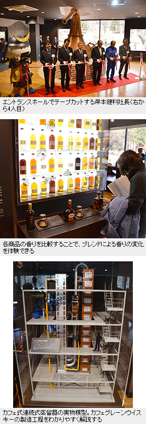 アサヒビールのウイスキー製造子会社であるニッカウヰスキーは、宮城県仙台市にある宮城峡蒸溜所の見学施設「ビジターセンター」を新設し、3月27日にオープンした。「体験できる」をコンセプトに、創業者、竹鶴政孝のウイスキー造りへの情熱や歴史、ウイスキーの特徴などを、香りを体験できる展示や試飲セミナーを通して五感に訴える。設備投資額は2億6000万円で、17年の来場者数は23万人を見込む。  宮城峡蒸溜所は1969年に開業し、単式蒸留器と連続式蒸留器を併せ持つ