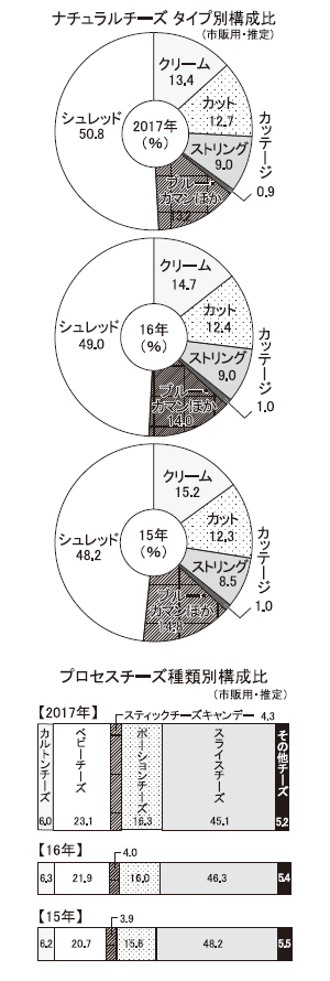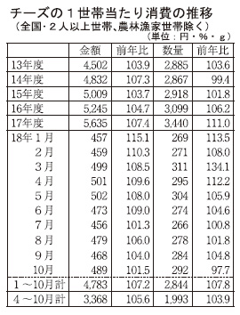 18年度上期(4~9月)のチーズ業界は、近年続いている需要拡大の勢いをそのままに、アップトレンドを維持し推移している。大手メーカーを中心に価格改定があったものの、家庭用市場では4~5%増という声が多く、家計調査でも4~9月で数量・金額ともに毎月前年超えを維持。業務用では夏場の猛暑の影響などで外食・製パン向けがマイナスに振れたが、秋冬以降の回復が期待されるところだ。プロセスチーズ(PC)では即食や家飲みニーズなどに対応し、底堅く推移。カビ系チーズに関する健康効果のTV報道が大