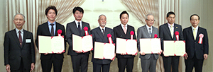 6人の生産者と記念撮影(左端雑賀慶二東洋ライス社長、右端鈴木秀之米・食味鑑定士協会会長)