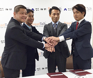 しっかり手を重ねる藤尾益雄神明社長(中央右)と郭明忠ブレッドトーク董事長(同左)