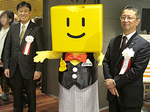 左から本村直之日本輸入チーズ普及協会会長、「ハイ!チーズ」君、西尾啓治チーズ普及協議会会長